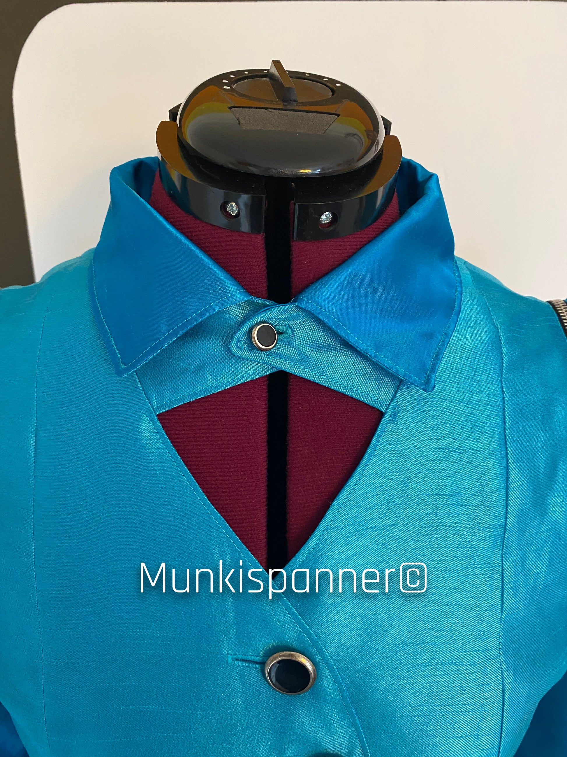 Features: One off! 6 way blazer/dress - can be worn 6 different ways, sleeves on with collar fastened, sleeves on with collar open, sleeves off with collar fastened, sleeves off with collar open. It can be worn as a mini dress or a jacket. It’s has zip off removable sleeves, button up front, cut out collar detail, fish dart shaping, fully lined, made from a beautiful tonal blue Shantung fabric.